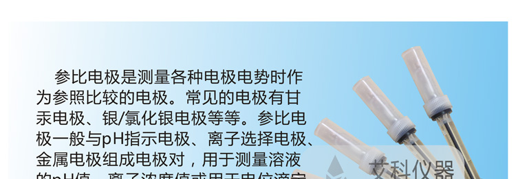 參比電極是測量各種電極電勢時作為參照比較的電極。常見的參比電極有甘汞電極、銀/氯化銀電極等。參比電極一般與pH指示電極、離子選擇電極、金屬電極組成電極對,用于測量溶液的pH值、離子濃度值或用于電位滴定分析。