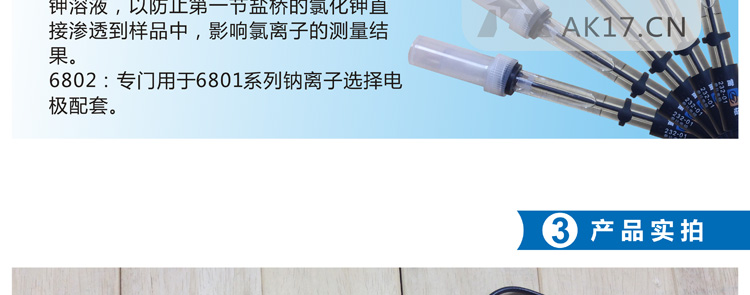 217:第二節鹽橋的補充液可根據用戶需求自行選擇。如測量樣品中較低氯離子濃度時,可以在第二節鹽橋內填充硝酸鉀溶液,以防止**節鹽橋的氯化鉀直接滲透到樣品中,影響氯離子的測量結果。