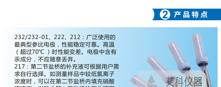 232/232-01、222、212:廣泛使用的**典型參比電極,性能穩定可靠。高溫(超過70℃)時性能變差。電極中含有汞成分,不應隨意丟棄。
