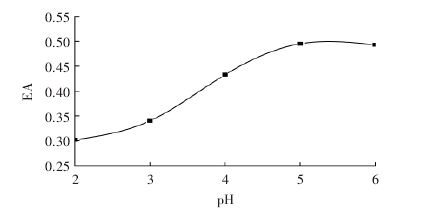 鄧塔[5]等人在研究大豆乳化性質的課題中,采用不同梯度的pH值對大豆蛋白粉進行處理,加熱溫度為60℃下,采用1mol/L的鹽酸調節大豆蛋白溶液的pH,范圍為2.0-6.0,處理30min,測定其乳化性。結果如圖: