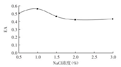 鄧塔[5]等人采用不同濃度的NaCl處理改性后(加熱溫度為50℃、pH=6.0、加熱時間為60min)的大豆蛋白,分別向5份40mL2.0%的大豆蛋白溶液中添加不同劑量的NaCl,形成0.5%、1.0%、1.5%、2.0%、3.0%系列濃度。不同濃度的Na+對改性大豆蛋白乳化性影響見圖4: