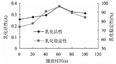 顧楠[9]等人對鷹嘴豆分離蛋白應用不同處理方式,并研究了這些處理方式對蛋白乳化性質的影響。課題中取100ml濃度為0.5%(w/v)的蛋白質溶液,用 0.5mol/L的NaOH調節pH為7.0,然后置于微波爐中處理,微波爐功率為800w,處理時間分別為0、20、40、6080、100s,處理完后加入20mL大豆色拉油,高速攪拌后根據2.2.1中所述方法測定EA和ES。