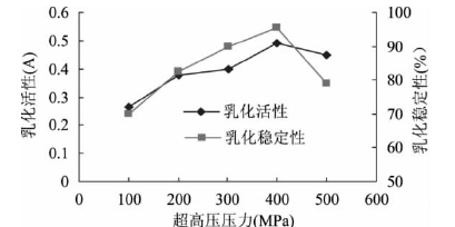 在壓力為400MPa時,其乳化活力和乳化穩定性達到**大值,這是由于超高壓使蛋白質結構發生了變化,蛋白質分子內部疏水相互作用逐漸受到破壞,更多的疏水性區域暴露,增加了蛋白的表面疏水性,疏水基團的暴露使蛋白質更易于吸附**油-水界面上并展開,從而提高了乳化性。隨著壓力的進一步增加,蛋白發生進一步聚集使得溶解性下降,導致吸附到油-水界面上的蛋白濃度下降,所以乳化性和乳化穩定性又出現下降。