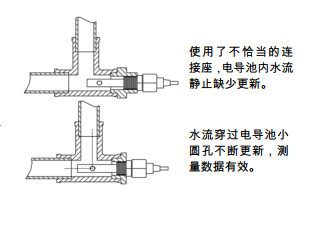 為確保電導池測量結果準確,應避免電導池間因有氣泡或死水而造成數據失準,請嚴格按下圖正確安裝方式安裝: