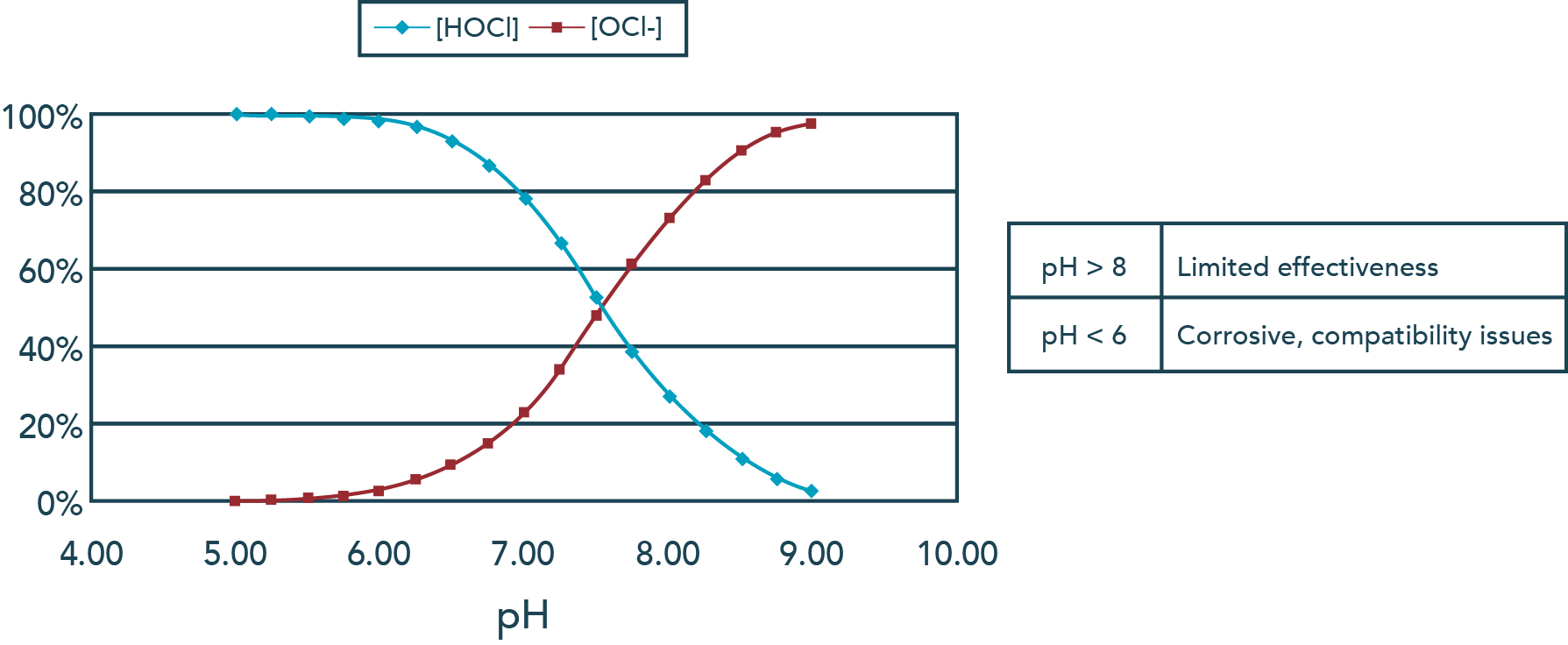 氯可以作為游離氯或氯胺存在。兩組都可以氧化化合物并實現(xiàn)治療目標,但是,需要更多的氯胺來滿足相同的氯需求。游離氯測量分別考慮水中的離子形式和質(zhì)子化形式的氯,OCl-和HOCl。在這兩者中,HOCl(次氯酸)是更強的氧化劑,并且在7.5的pH下是主要的。